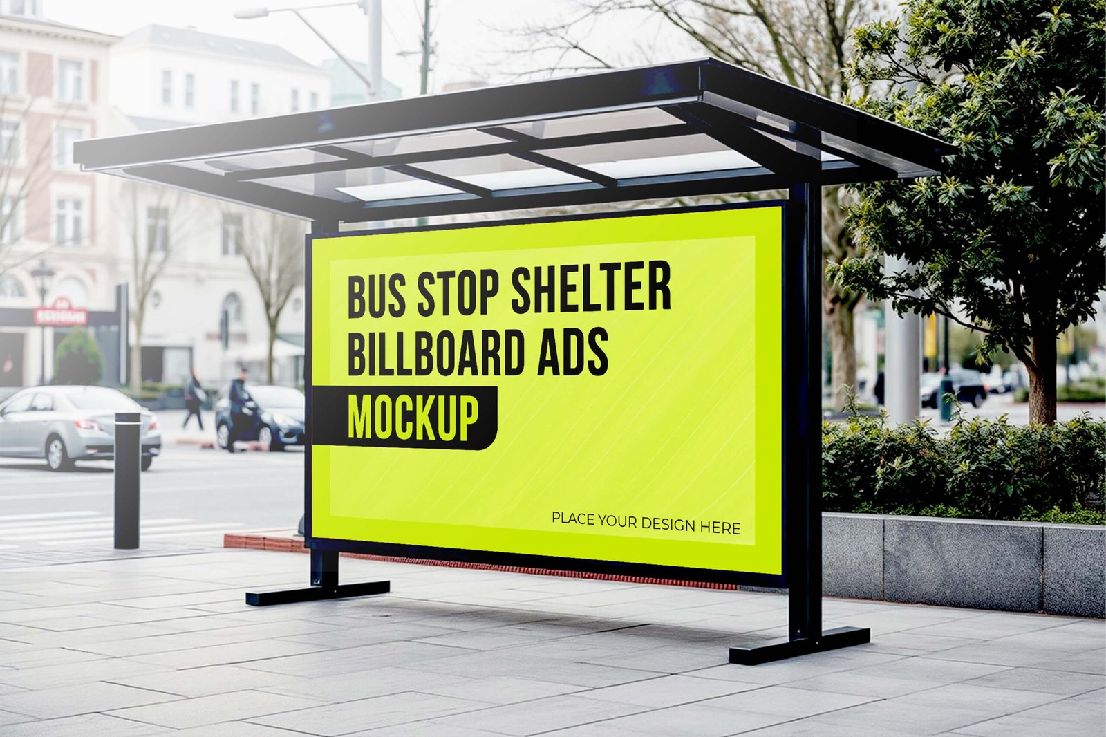 Bus Shelter Mockup, Outdoor Bus Stop Shelter Advertisement Mockup 2.psd